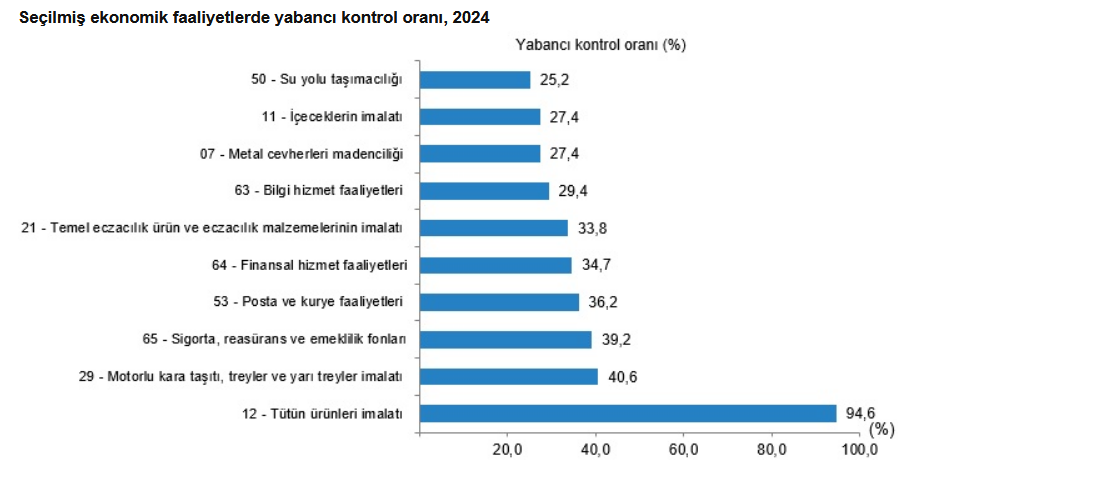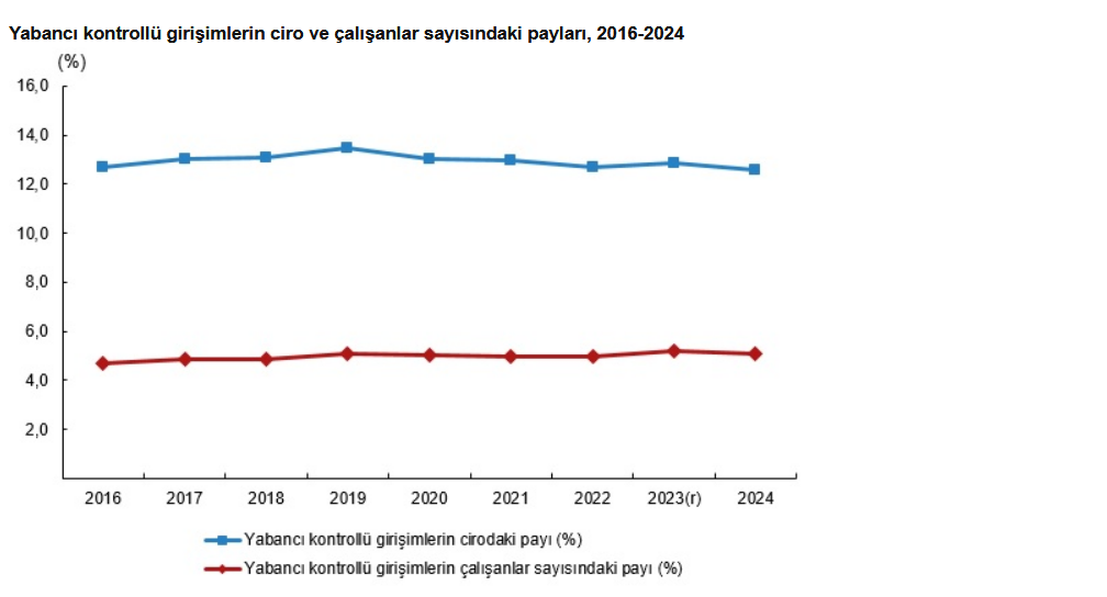Türkiye İstatistik Kurumu (TÜİK) verilerine göre, Yabancı kontrollü girişim istatistiklerine göre yabancı kontrolündeki girişim sayısı 2023 yılında 10 bin 673 ve 2024 yılında 11 bin 86 oldu. Bu girişimlerin toplam cirodaki payı 2023 yılında yüzde 12,9, 2024’te ise yüzde 12,6 oldu. Yabancı kontrollü girişimlerdeki çalışanlar sayısının toplam çalışanlar sayısı içinde payı 2023 yılında yüzde 5,2, 2024’te ise yüzde 5,1 oldu.