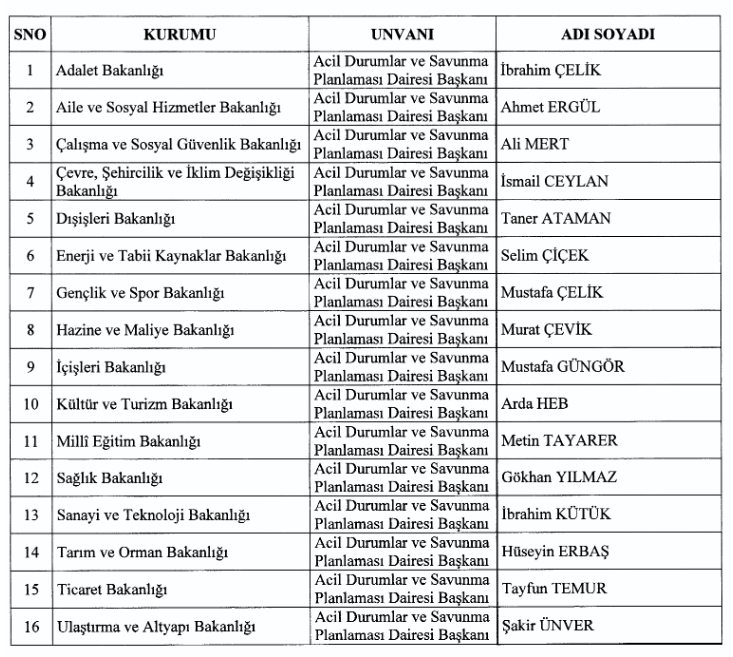 Bakanlıkların ekli listede yer alan Acil Durumlar ve Savunma Planlaması Dairesi Başkanlıklarına hizalarında belirtilen kişiler atandı: