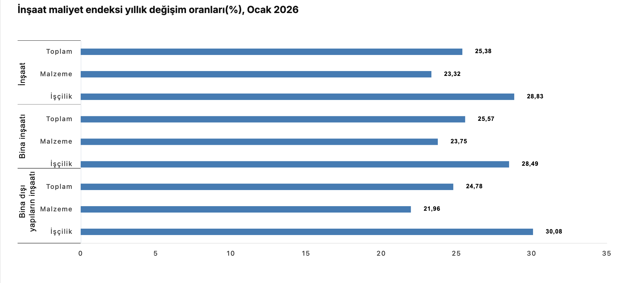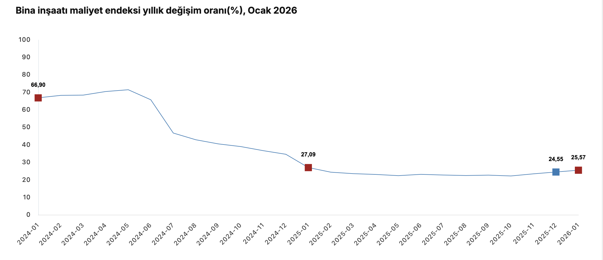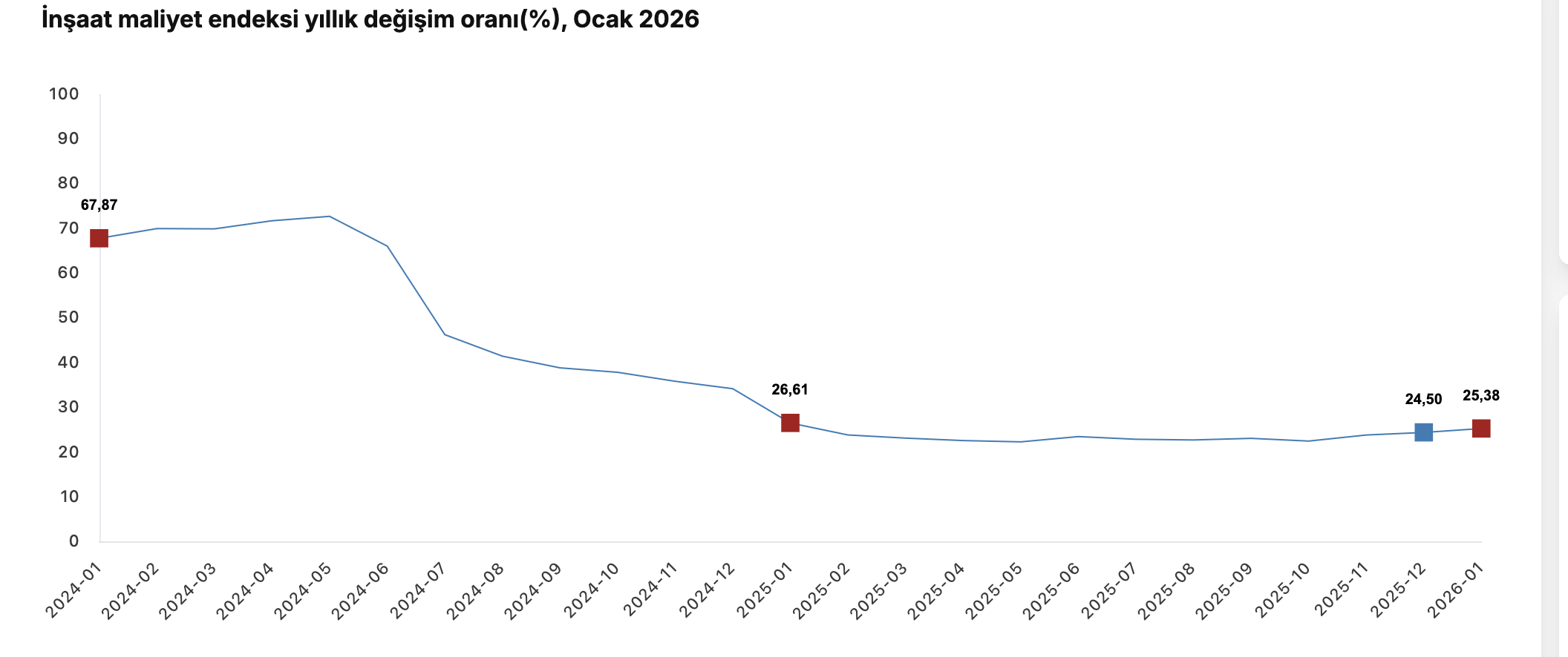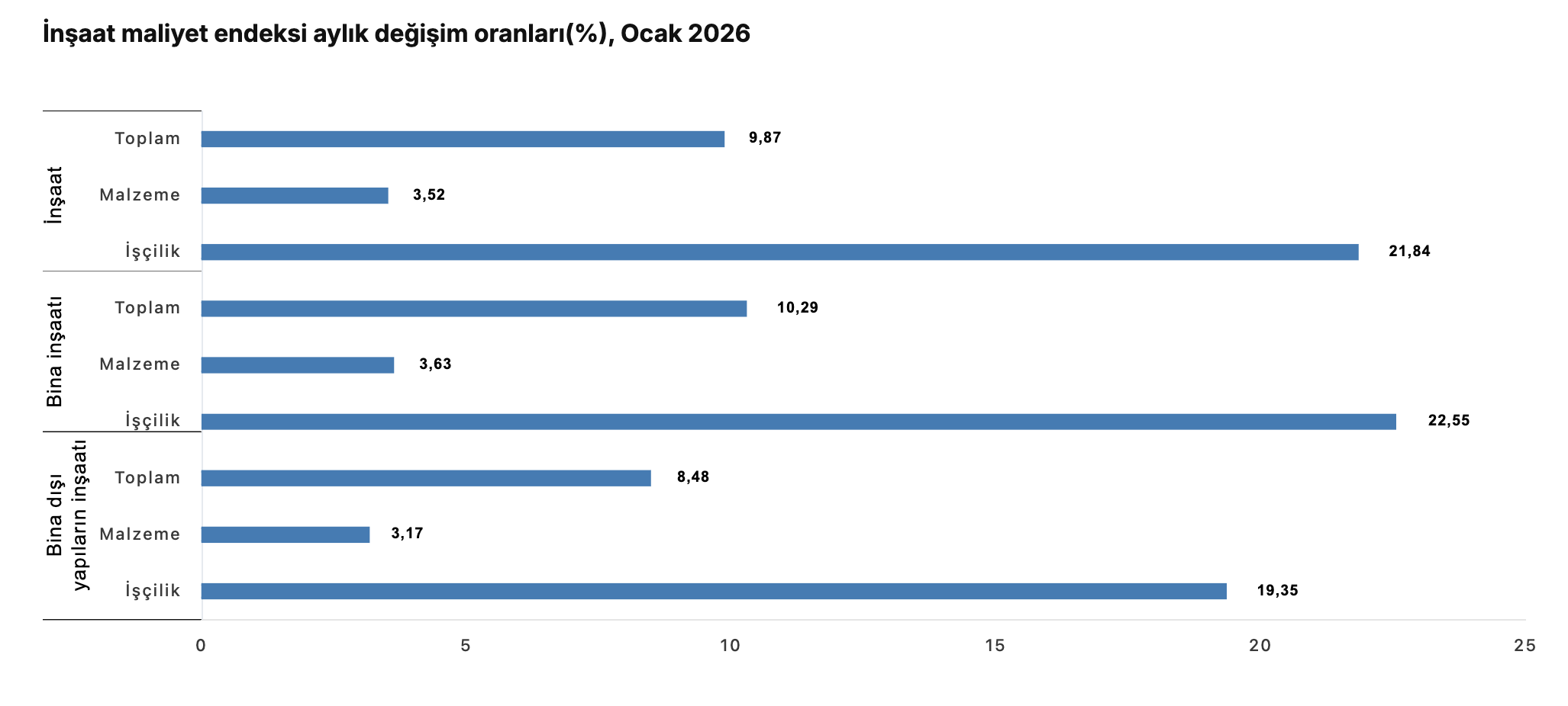 İstanbul, 10 Mart (Hibya) – İnşaat maliyet endeksi, 2026 yılı Ocak ayında bir önceki aya göre yüzde 9,87 artarken, bir önceki yılın aynı ayına göre yüzde 25,38 artış gösterdi.