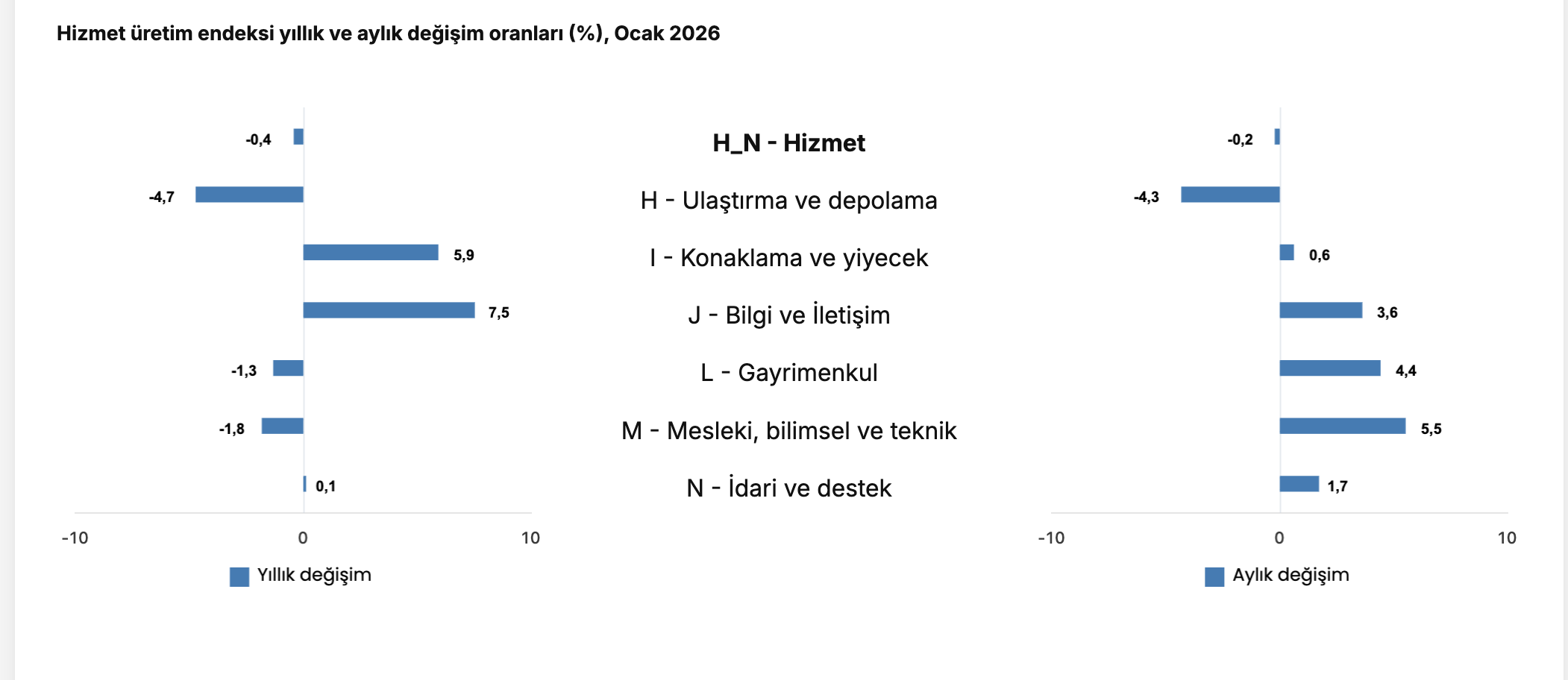 Türkiye İstatistik Kurumu’nun (TÜİK) verilerine göre, aynı ayda ulaştırma ve depolama hizmetleri yüzde 4,7 azaldı, konaklama ve yiyecek hizmetleri yüzde 5,9 arttı, bilgi ve iletişim hizmetleri yüzde 7,5 arttı, gayrimenkul hizmetleri yüzde 1,3 azaldı, mesleki, bilimsel ve teknik hizmetler yüzde 1,8 azaldı, idari ve destek hizmetleri ise yüzde 0,1 arttı.