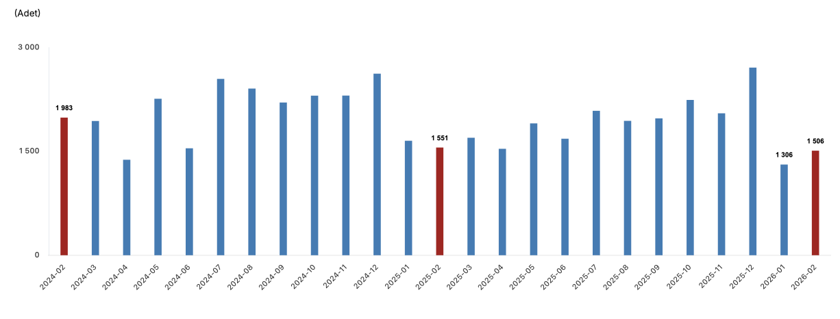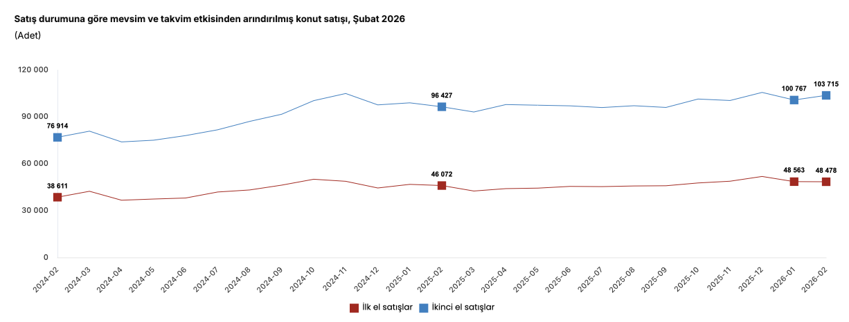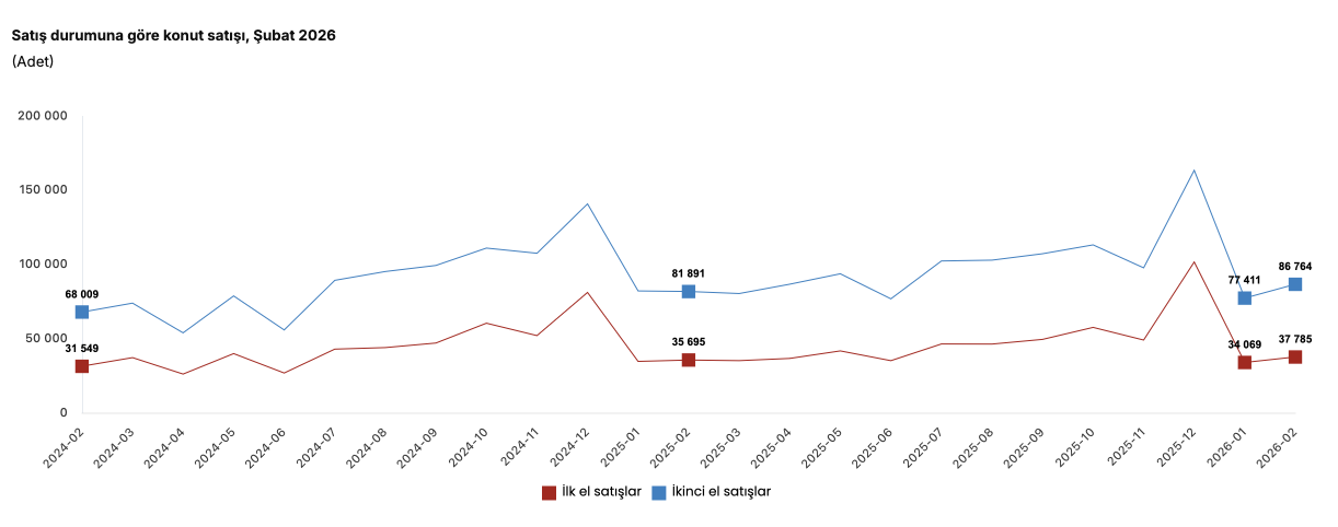 Türkiye İstatistik Kurumu’nun (TÜİK) verilerine göre,Türkiye genelinde ilk el konut satış sayısı Şubat ayında bir önceki yılın aynı ayına göre yüzde 5,9 oranında artarak 37 bin 785 oldu. İkinci el konut satışları ise Şubat ayında bir önceki yılın aynı ayına göre yüzde 6,0 oranında artarak 86 bin 764 oldu. Toplam konut satışları içinde ilk el konut satışlarının payı yüzde 30,3, ikinci el konut satışlarının payı yüzde 69,7 oldu.