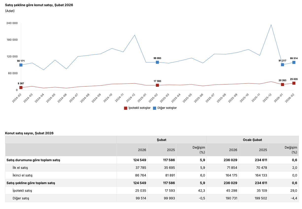 Türkiye genelinde ipotekli konut satışları Şubat ayında bir önceki yılın aynı ayına göre yüzde 42,3 oranında artarak 25 bin 35 oldu. Diğer konut satışları ise Şubat ayında bir önceki yılın aynı ayına göre yüzde 0,5 oranında azalarak 99 bin 514 oldu. Toplam konut satışları içinde ipotekli satışların payı yüzde 20,1 diğer satışların payı yüzde 79,9 olarak gerçekleşti.