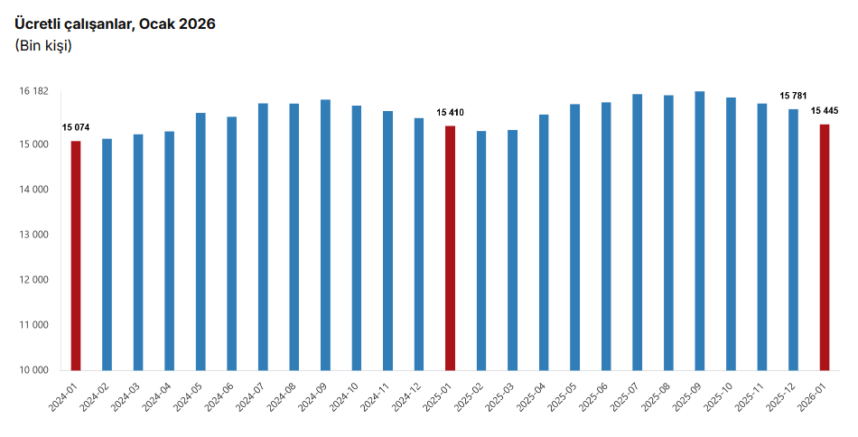 Türkiye İstatistik Kurumu’nun (TÜİK) verilerine göre; sanayi, inşaat ve ticaret-hizmet sektörleri toplamında ücretli çalışan sayısı 2026 Ocak ayında bir önceki yılın aynı ayına göre yüzde 0,2 arttı. Ücretli çalışan sayısı bir önceki yılın aynı ayında 15 milyon 410 bin 257 kişi iken, 2026 yılı Ocak ayında 15 milyon 444 bin 683 kişi oldu.