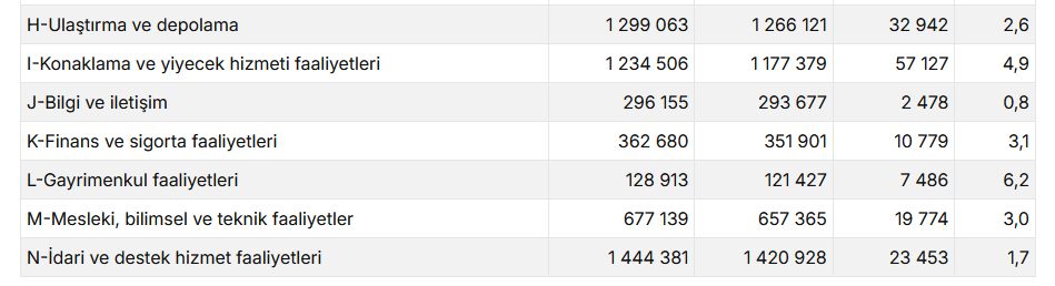 Ücretli çalışanların alt detaylarına bakıldığında; 2026 Ocak ayında ücretli çalışan sayısı yıllık olarak sanayi sektöründe yüzde 3,5 azaldı, inşaat sektöründe yüzde 0,3 arttı ve ticaret-hizmet sektöründe yüzde 2,3 arttı.