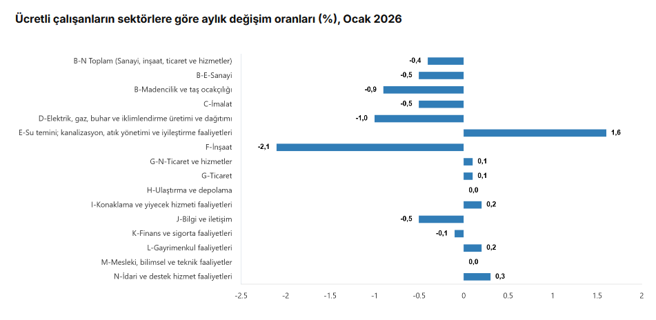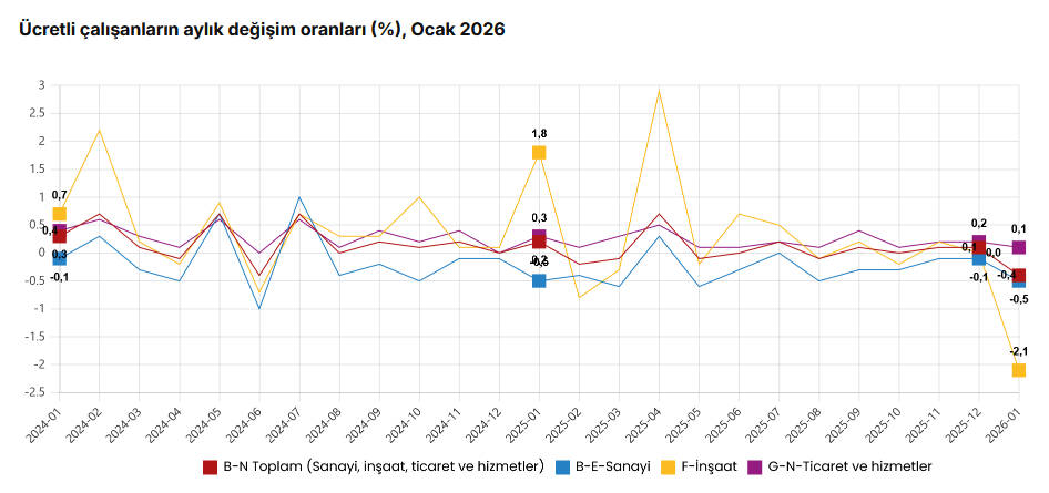 Ücretli çalışanların alt detaylarına bakıldığında; 2026 Ocak ayında ücretli çalışanlar aylık olarak sanayi sektöründe yüzde 0,5 azaldı, inşaat sektöründe yüzde 2,1 azaldı ve ticaret-hizmet sektöründe yüzde 0,1 arttı.