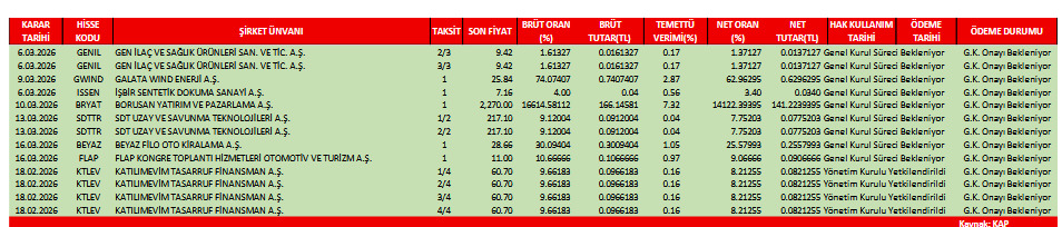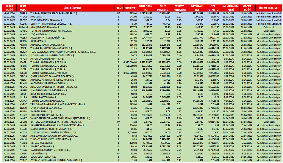 Alnus Yatırım’ın raporuna göre, şirketlerin dağıtmayı planladığı nakit temettü tutarı, temettü dağıtım tarihi ve temettü verileri şu şekilde:
