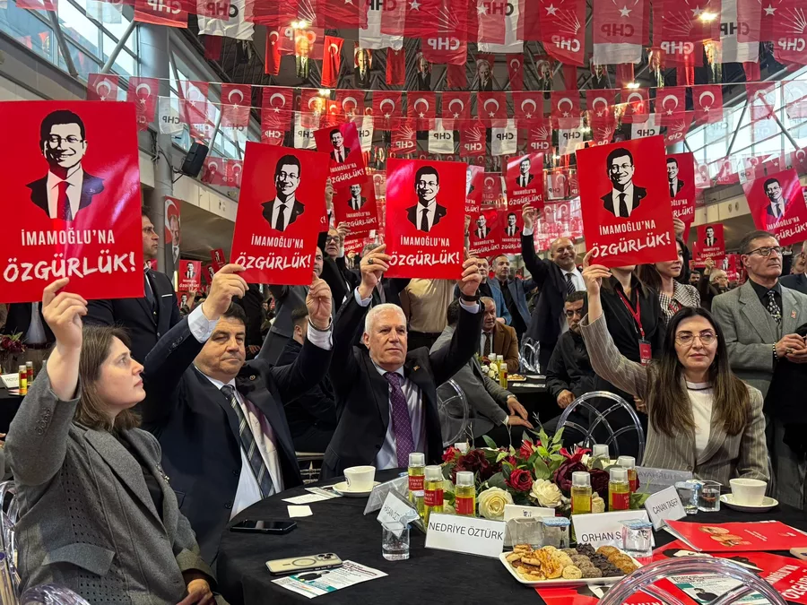 Tutuklu İstanbul Büyükşehir Belediye Başkanı Ekrem İmamoğlu’na destek mesajı verilen törende, salonda bulunan belediye başkanları, milletvekilleri ve parti üyeleri de aynı pankartları kaldırarak destek verdi.