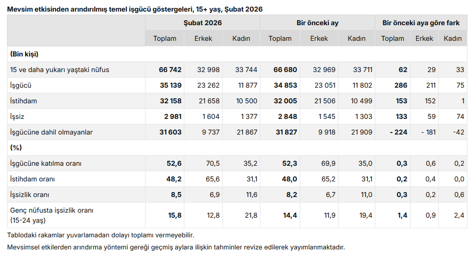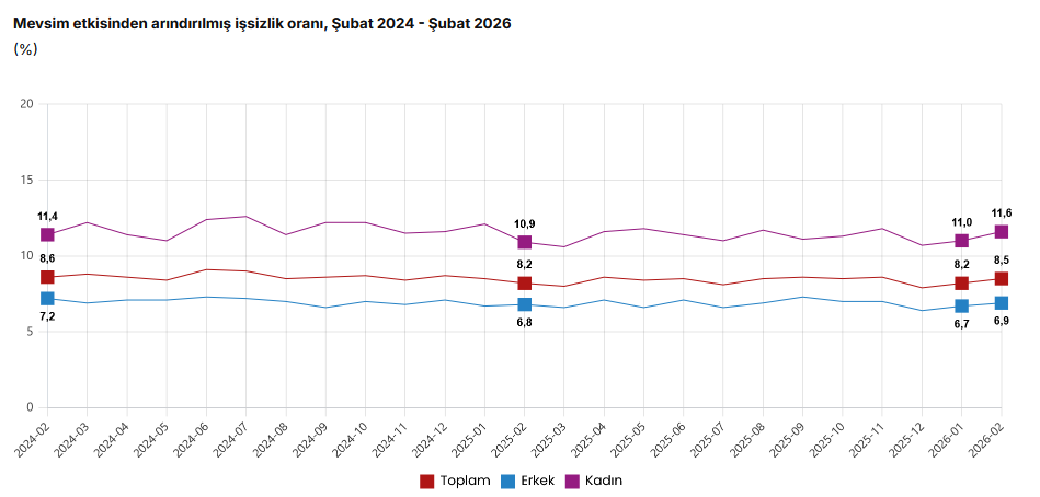 Türkiye İstatistik Kurumu’nun (TÜİK) verilerine göre, Hanehalkı İşgücü Araştırması sonuçlarına göre; 15 ve daha yukarı yaştaki kişilerde işsiz sayısı 2026 yılı Şubat ayında aylık bazda 133 bin kişi artarak 2 milyon 981 bin kişi oldu. İşsizlik oranı ise 0,3 puan artarak yüzde 8,5 seviyesinde gerçekleşti. İşsizlik oranı erkeklerde yüzde 6,9 iken kadınlarda yüzde 11,6 olarak tahmin edildi.