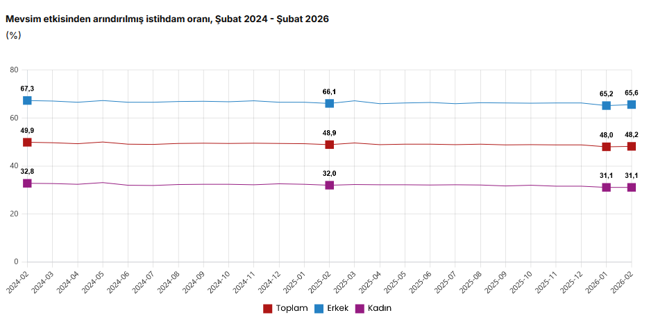 İstihdam edilenlerin sayısı 2026 yılı Şubat ayında bir önceki aya göre 153 bin kişi artarak 32 milyon 158 bin kişi, istihdam oranı ise 0,2 puan artarak yüzde 48,2 oldu. Bu oran erkeklerde yüzde 65,6 iken kadınlarda yüzde 31,1 olarak gerçekleşti.