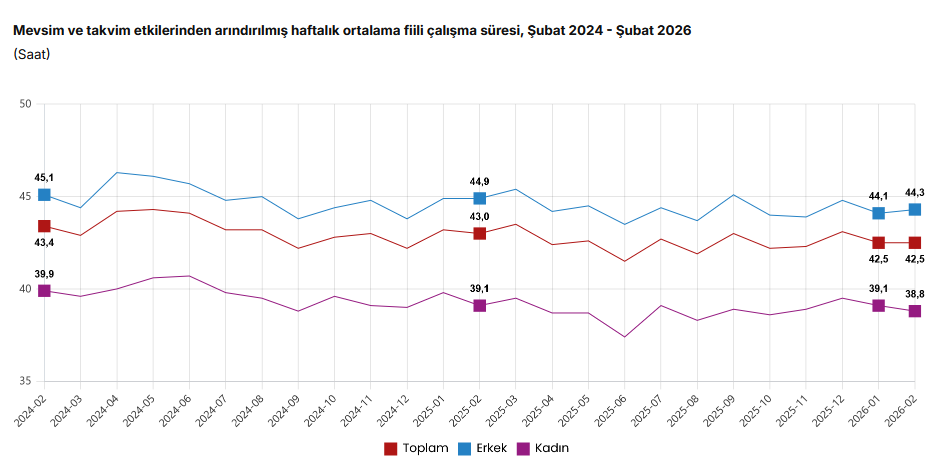 İstihdam edilenlerden referans döneminde işbaşında olanların, mevsim ve takvim etkilerinden arındırılmış haftalık ortalama fiili çalışma süresi 2026 yılı Şubat ayında bir önceki aya göre aynı seviyede kalarak 42,5 saat olarak gerçekleşti.