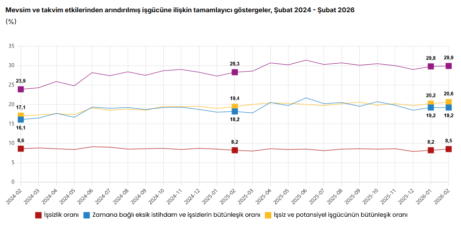 Zamana bağlı eksik istihdam, potansiyel işgücü ve işsizlerden oluşan atıl işgücü oranı 2026 yılı Şubat ayında bir önceki aya göre 0,1 puan artarak yüzde 29,9 oldu. Zamana bağlı eksik istihdam ve işsizlerin bütünleşik oranı yüzde 19,2 iken işsiz ve potansiyel işgücünün bütünleşik oranı yüzde 20,6 olarak tahmin edildi.