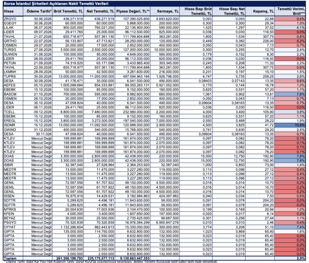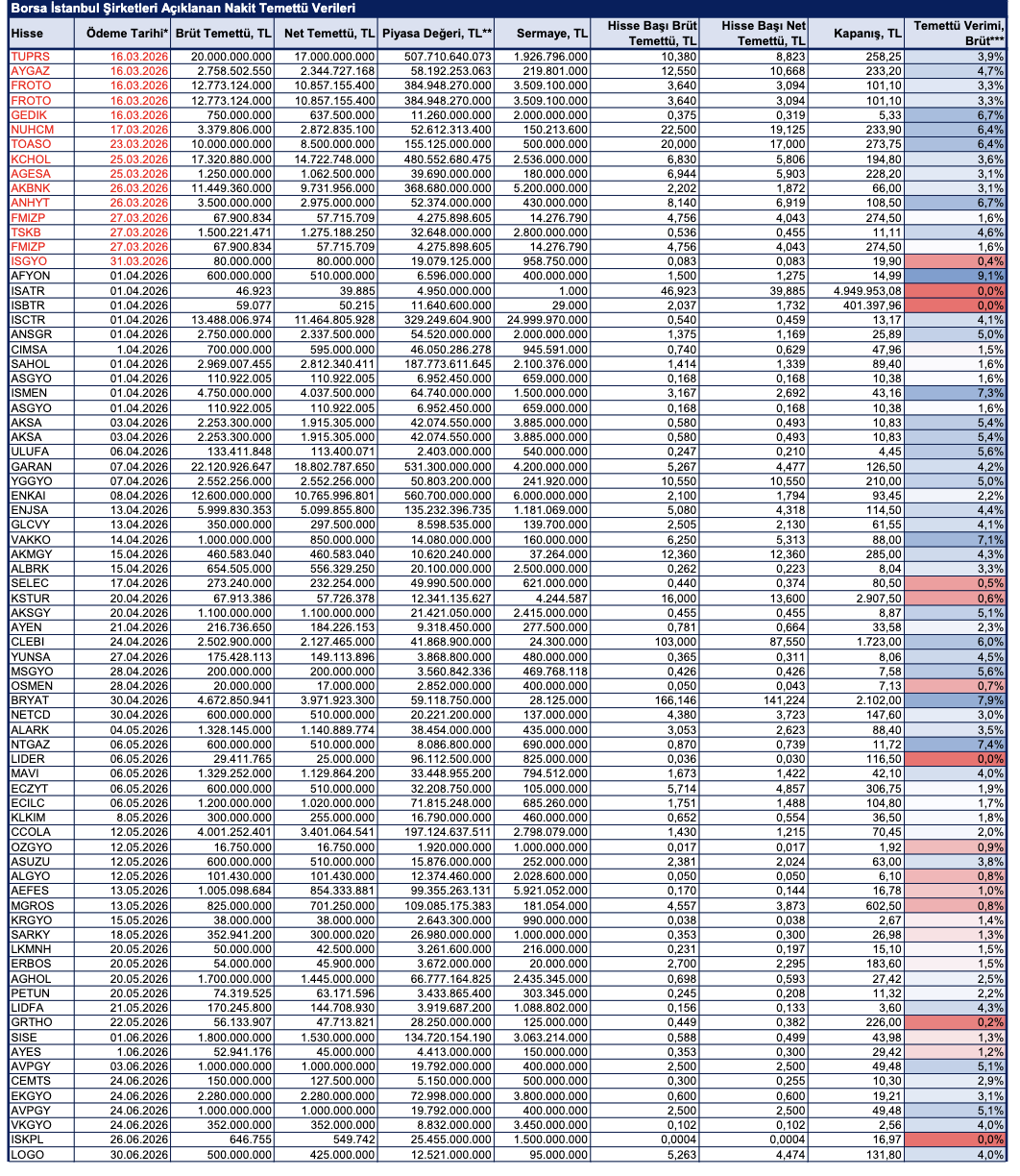 BMD Araştırma’nın analizine göre, 2025 yılı karından temettü dağıtımına dair yönetim kurulu kararı almış BİST şirketlerinin dağıtmayı planladığı nakit temettü tutarı, temettü dağıtım tarihi ve temettü verileri şu şekilde: