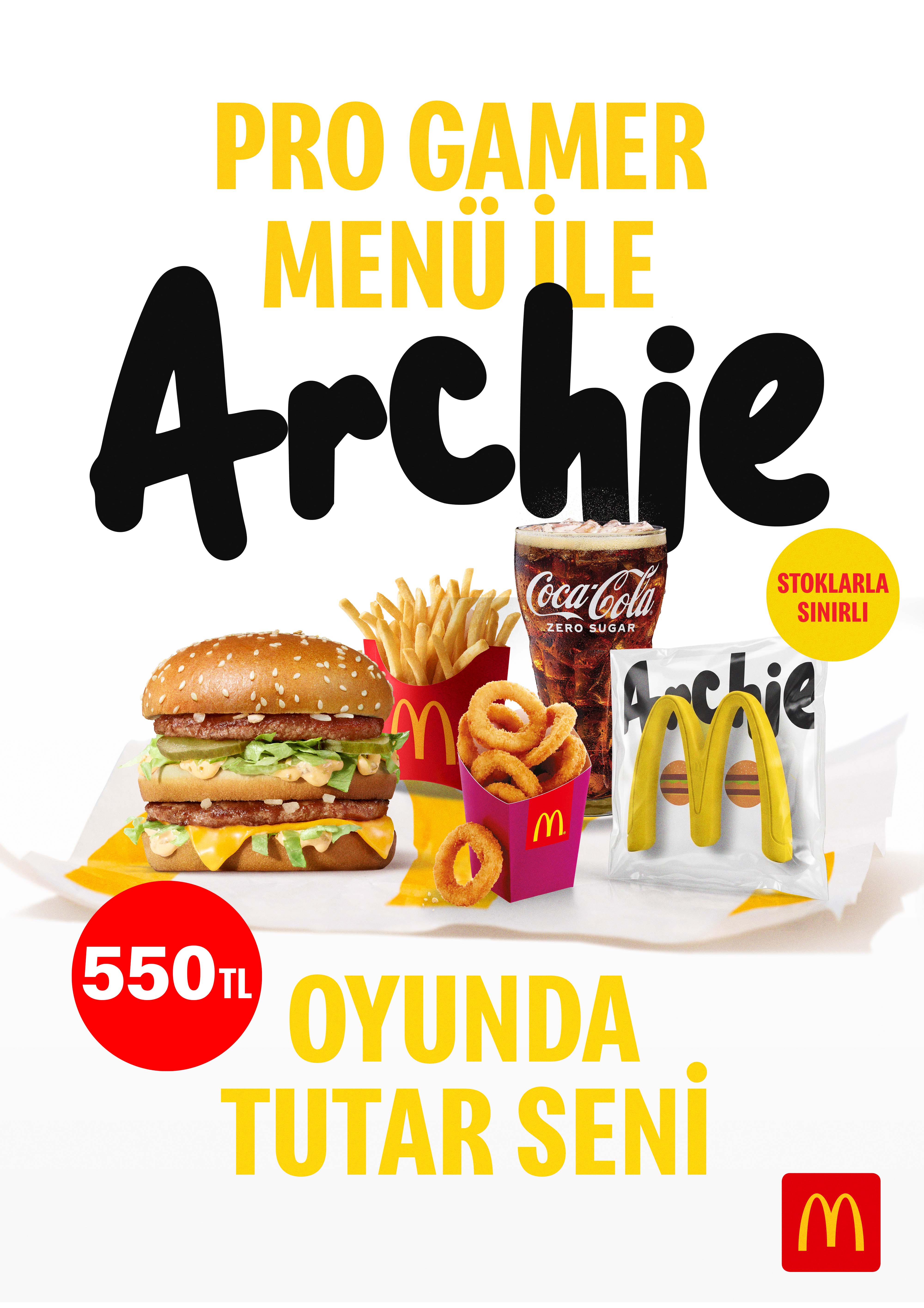 Pro Gamer Menü ile birlikte McDonald’s Türkiye misafirlerine sunulan Archie, markanın ikonik “M” formundan ilham alan esnek yapısıyla oyun konsolunun analog çubuklarını birbirine yaklaştırıyor ve oyuncunun kısa süreliğine oyundan uzak kalması halinde (AFK) karakterin hareket etmeye devam etmesine yardımcı oluyor. Sınırlı süreyle ve yalnızca adrese teslim siparişlerde sunulan Pro Gamer Menü; Big Mac®, orta boy patates, orta boy kola ve 8’li çıtır soğan eşliğinde oyuncularla buluşuyor. Yenilikçi proje, reklam ve pazarlama dünyasına ödüllü işleriyle yön veren TBWAIstanbul imzası taşıyor.