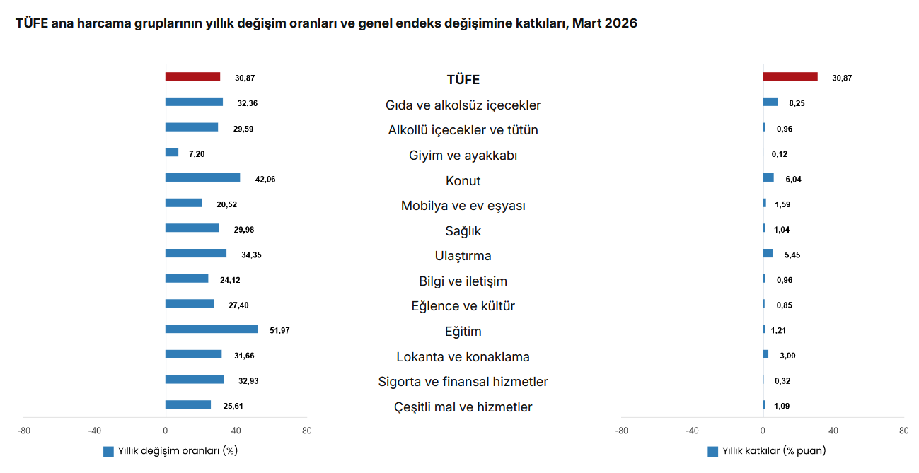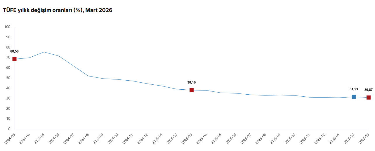Türkiye İstatistik Kurumu (TÜİK) verilerine göre, Mart 2026’da Tüketici Fiyat Endeksi (TÜFE) yıllık bazda yüzde 30,87 artış gösterdi. Aylık değişim ise yüzde 1,94 olarak gerçekleşti. Aralık 2025’e kıyasla artış yüzde 10,04, on iki aylık ortalamalara göre artış ise yüzde 32,82 oldu.